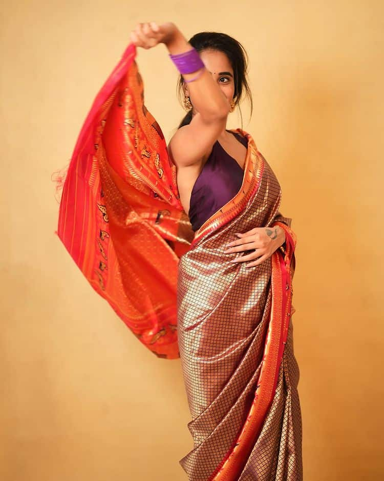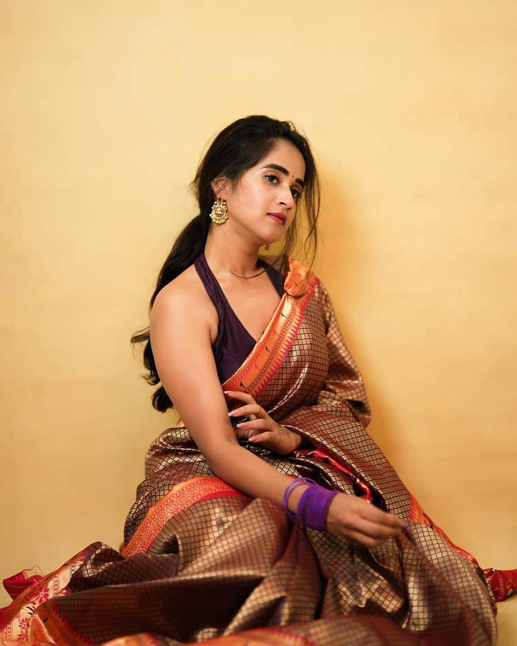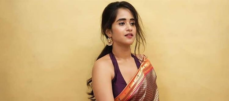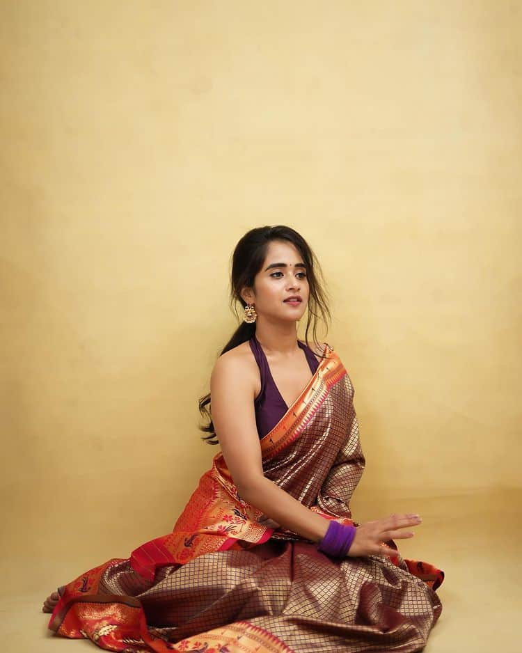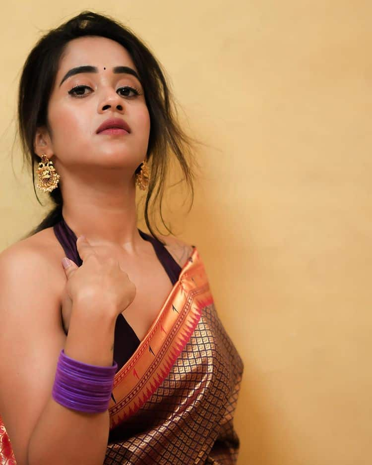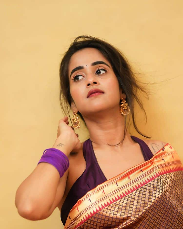 girl next door look as she dons a red-bordered saree and a sleeveless purple blouse. She truly resembled a Butta Bomma with her matching bangles and earrings. Internet star Deepthi Sunaina has become extremely well-known after she took part in