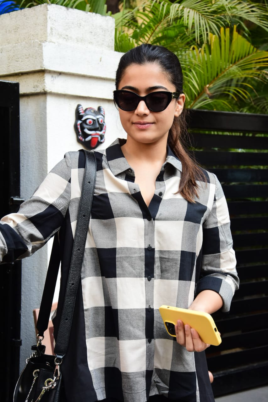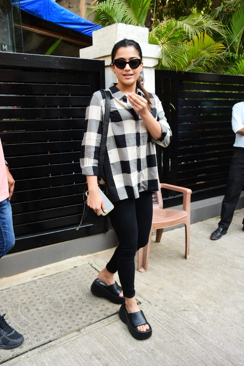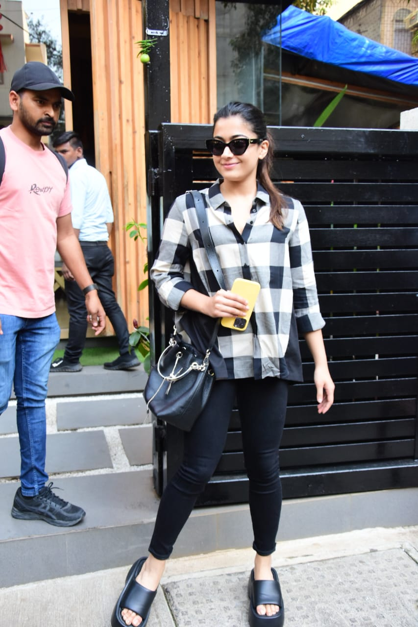rashmika mandanna chose a casual outfit for her day out since she wanted to make things easy and comfortable for the mumbai weather. The actress was photographed outside a restaurant in mumbai sporting the sexiest and trendiest round-toe slides of the season together with a checkered shirt and black jeans. One of the few actors that wears intriguing outfits that are both wearable and eye-catching is rashmika Mandanna.