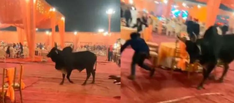 ఇక్కడ ఒక వివాహ వేడుకకు సంబంధించిన వీడియో కాస్త ట్విట్టర్ వేదికగా తెగ వైరల్ గా మారి పోతుంది అని చెప్పడం లో అతిశయోక్తి లేదు. సాధారణం గా వివాహ వేడుకకు కొన్ని కొన్ని సార్లు అనుకోని అతిథులు ఎంట్రీ ఇస్తూ ఉంటారు. ఇక ఇప్పుడూ ఇలాంటిదే జరిగింది. ఏకంగా ఒక ఎద్దు వివాహ వేడుక వద్దకు ఎంట్రీ ఇచ్చింది. ఏకం గా గేటును బద్దలు కొట్టుకొని మరి పెళ్లి మండపం లోకి దూసుకు వచ్చింది. దీంతో అక్కడున్న వారందరూ కూడా ఆ ఎద్దును చూసి ఒక్కసారిగా భయాందోళనకు గురయ్యారు.