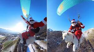 Santa is seen paragliding at a height of thousands of feet with his dog. people are having a lot of fun watching this video and are also commenting in various ways.