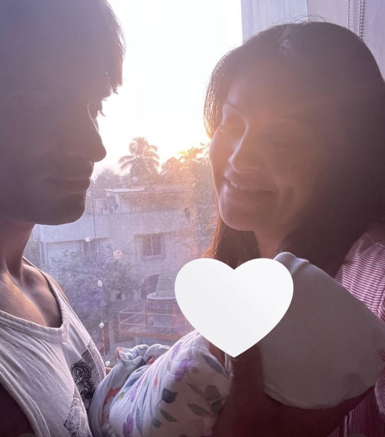 we got a glimpse of Devi on Bipasha's insta handle. In the beautiful picture, Bipasha and karan were seen enjoying the sunset with Devi in their arms. The little princess was made to wear a garland of flowers and a white cap. The couple hid their baby girl's face with a white heart-shaped sticker.
