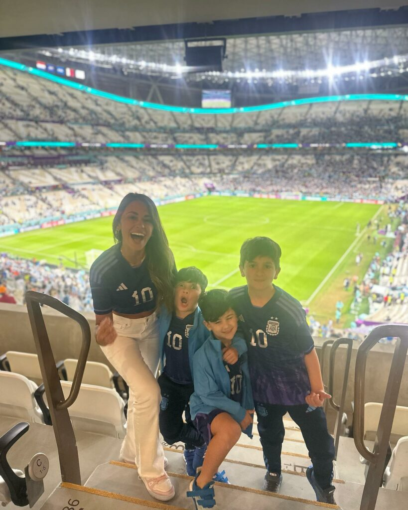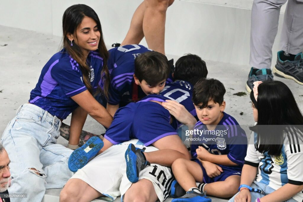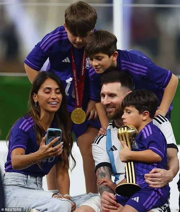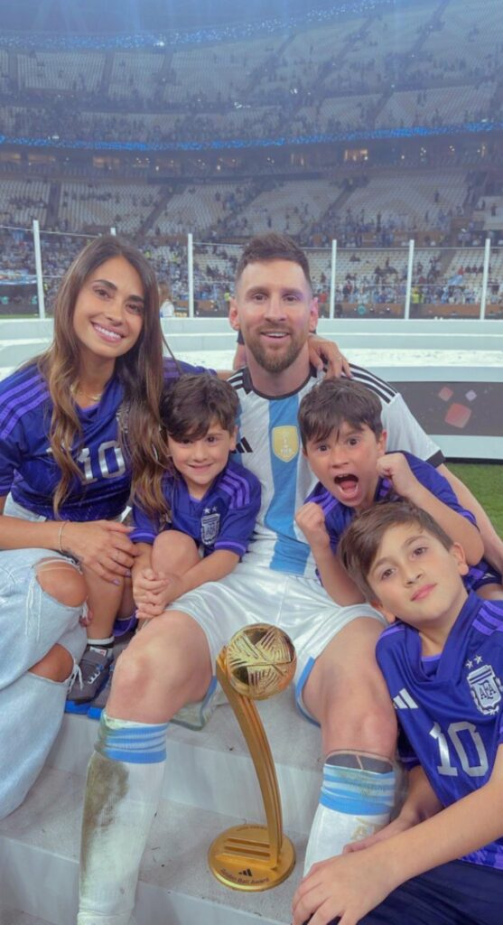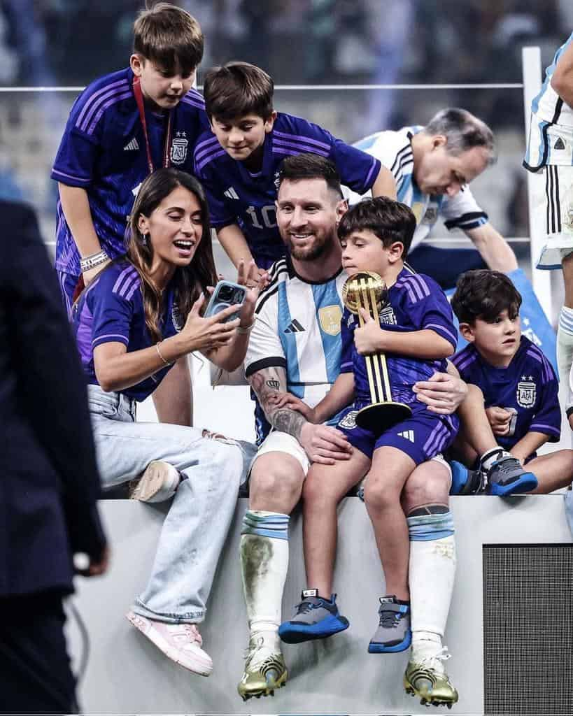 wife Antonela Roccuzzo, along with his three boys Mateo, Thiago, and Ciro, have joined him on the field to celebrate his significant victory.