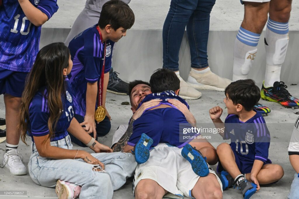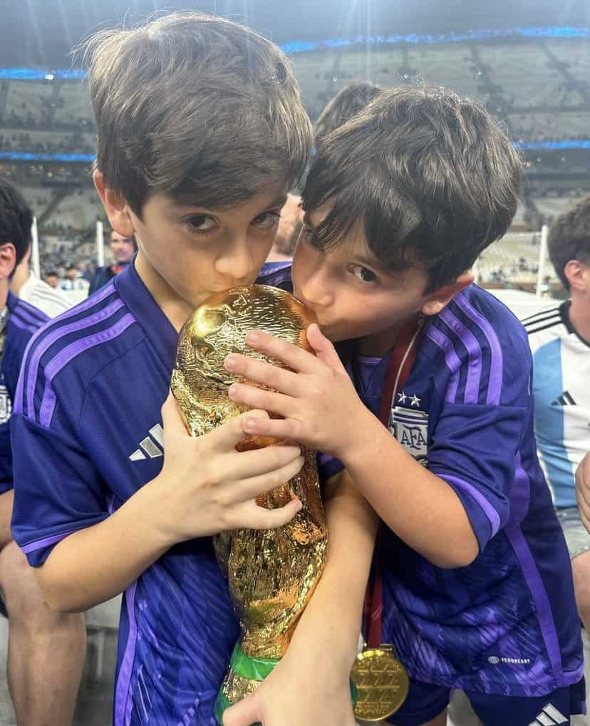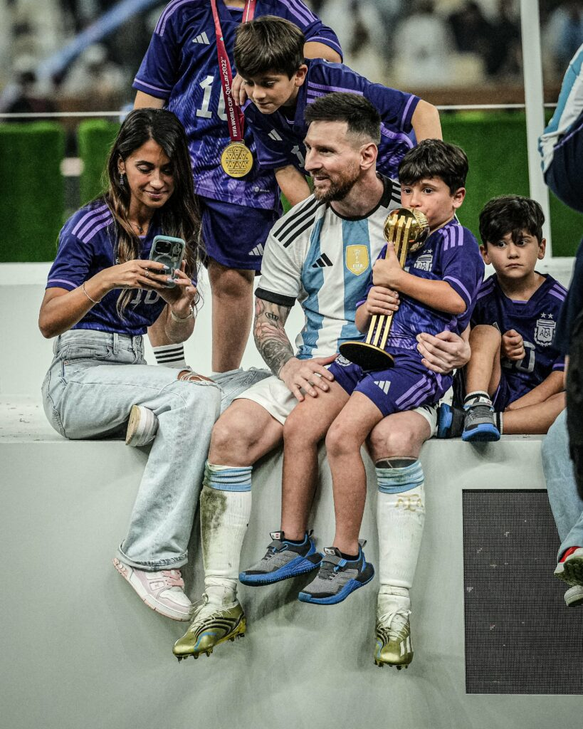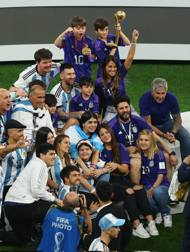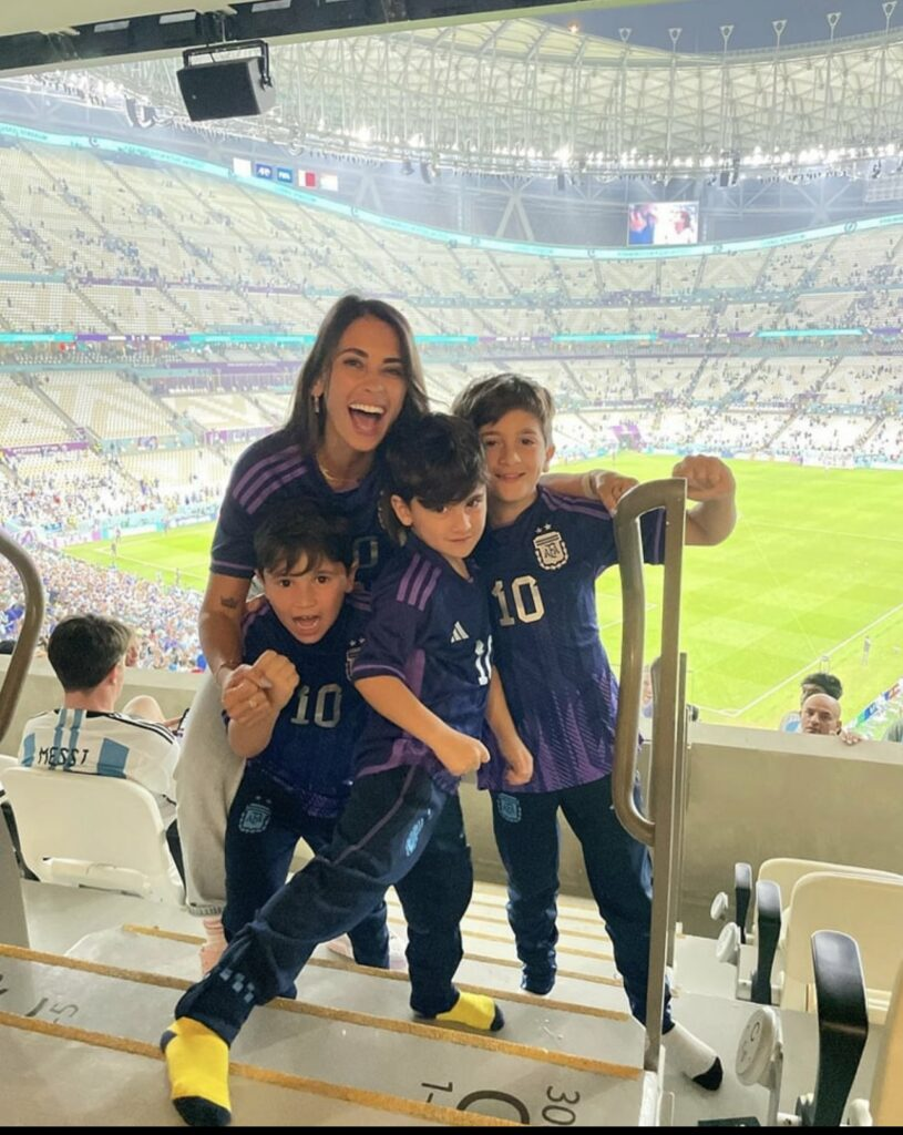 wife Antonela Roccuzzo, along with his three boys Mateo, Thiago, and Ciro, have joined him on the field to celebrate his significant victory.