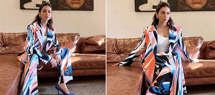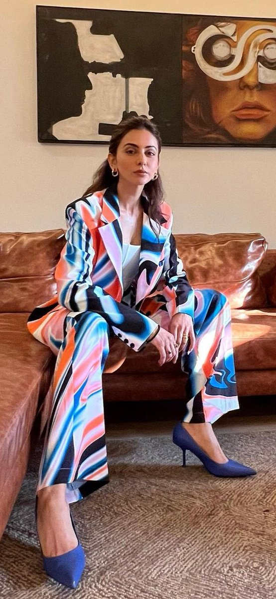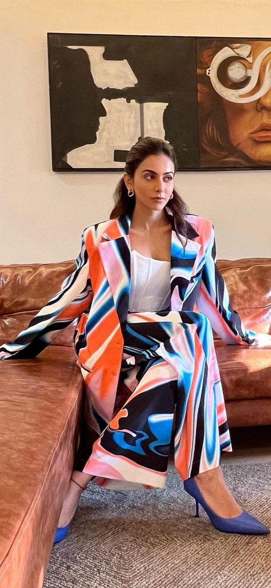 Rakul paired the eccentric ensemble, which featured abstract prints in hues of orange, blue, pink, and more, with a pair of wide-leg pants and a full-sleeved oversized blazer with button-down details. She completed the ensemble with royal blue pointed heels and a white corset top underneath the jacket. She chose simple cosmetics and