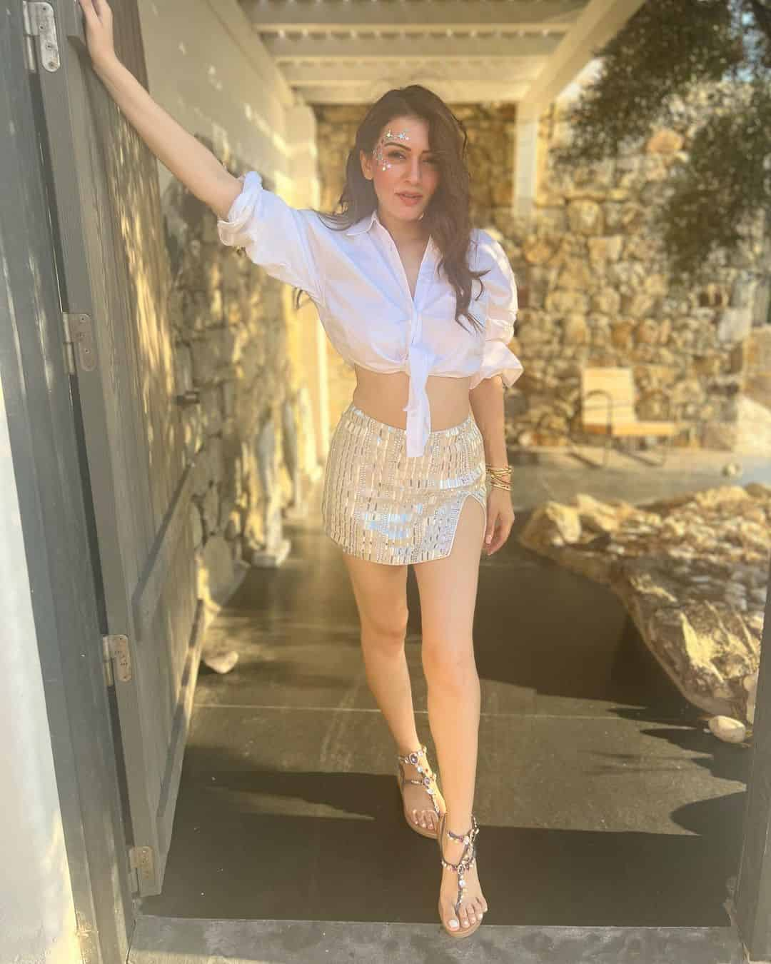 Looks like Hansika Motwani, a charming siren, is following a similar route after she discussed what it actually takes to make one's own sunlight. The other day, Hansika shared a few images of herself from the most recent project she undertook. When Hansika slipped on a microskirt with a thigh-high slit and a white shirt that was folded and tied in a knot, she added some glitz and once again upped the temperature.
