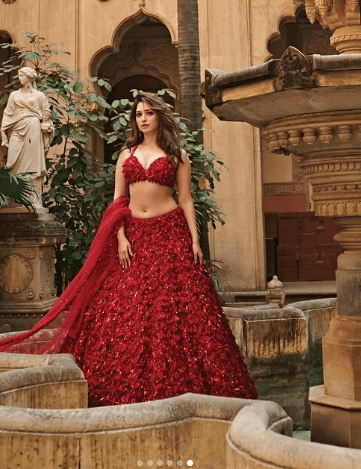red dress with a deep neckline and ruffles. She paired the appearance with smooth, wavy, middle-parted hair. The actress used just enough kohl to keep her eyes looking fresh. The actress finished the look with bare