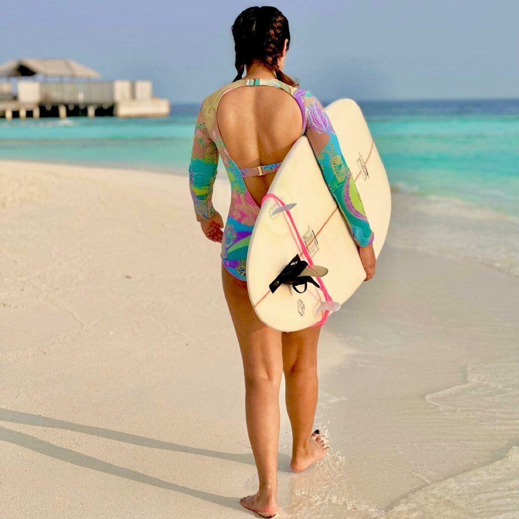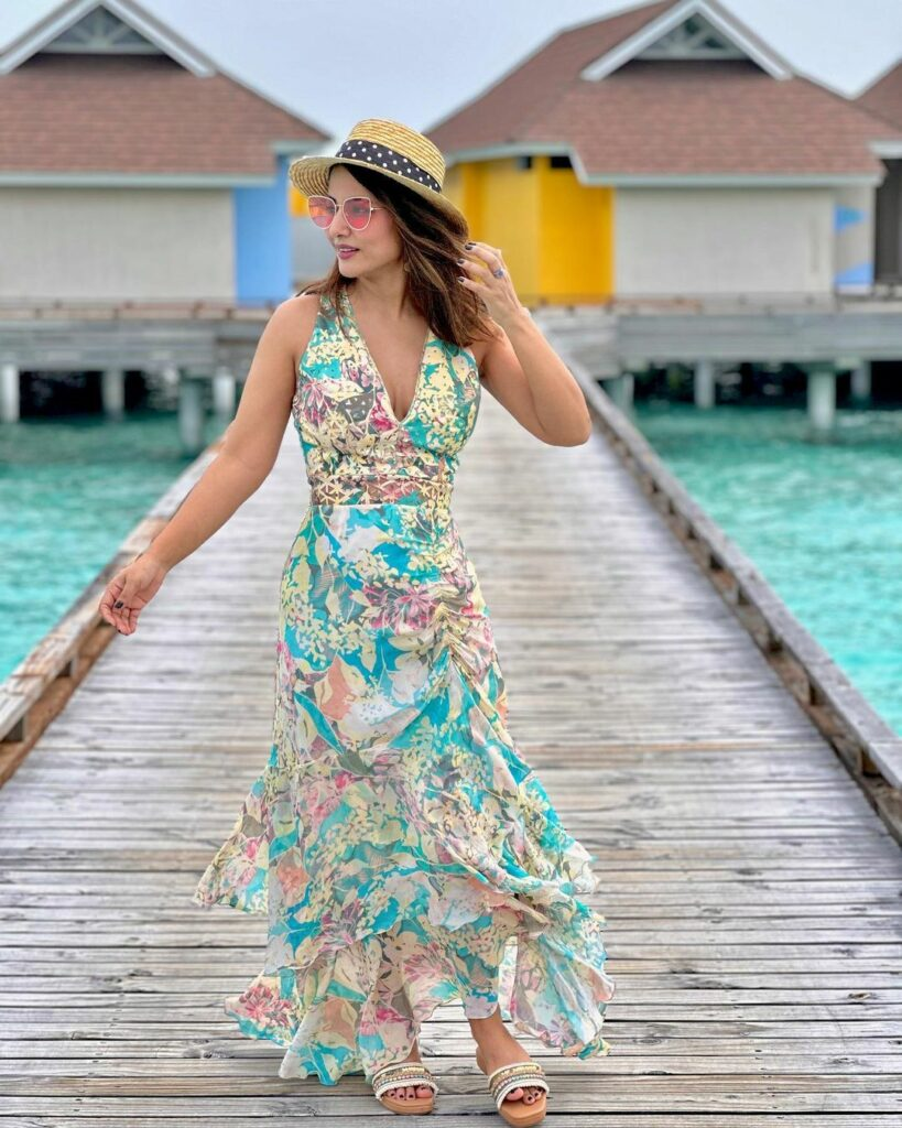maldives for a much-needed holiday. The actress showcased her sense of style in a lovely flowery maxi dress in breathtaking images she posted on