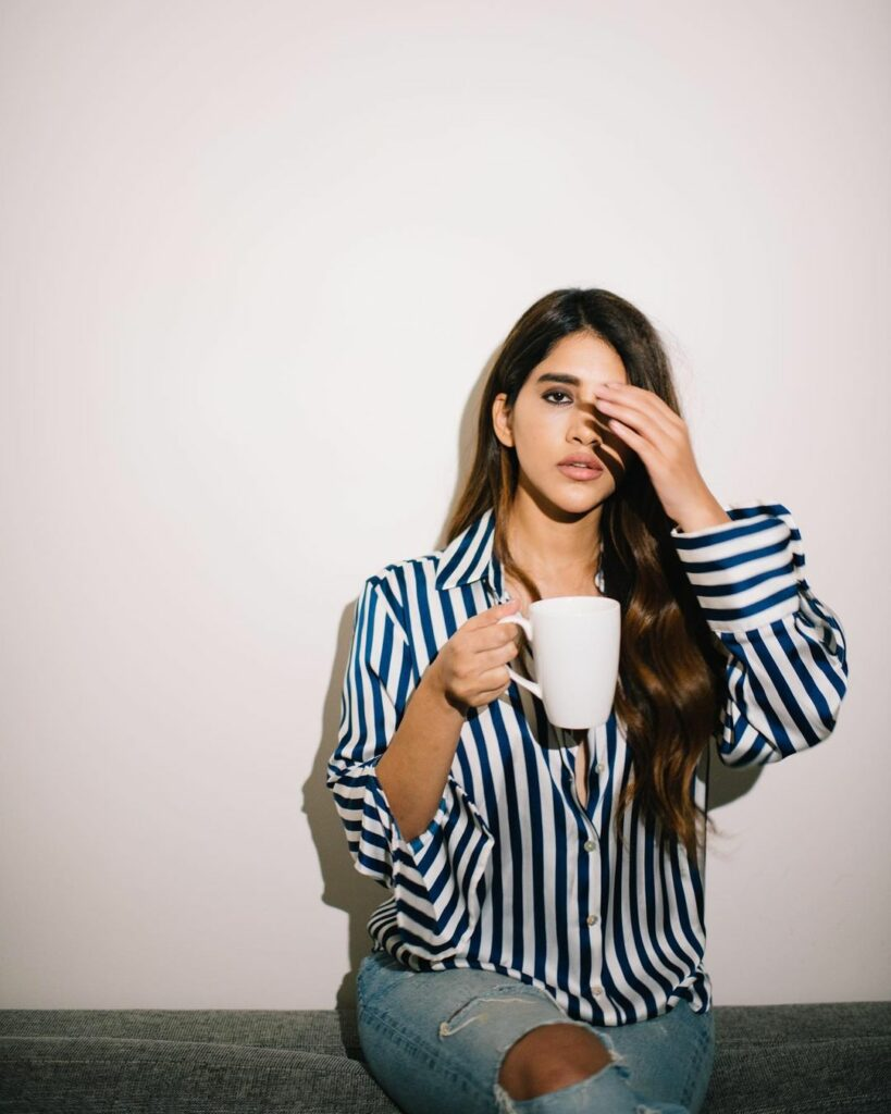 The most recent photo we have shows nabha natesh lounging on her couch while wearing an undone striped blouse that bares more skin. Her torn jeans are very seductive. May your coffee kick in before reality does, Nabha quotes the images while holding a cup of coffee. See the images before her coffee cools off. nabha natesh was in the best possible situation. She experienced tremendous success in 2019 as Chandini in puri Jagannadh's ismart shankar, and despite the collapse of disco raja in the early months of 2020, she was ready to go when the epidemic struck.