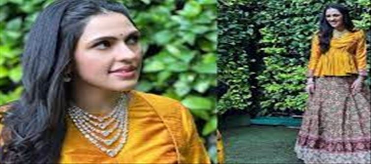 Shloka looked drop dead gorgeous in a golden saree for the event. She styled it with a contrasting silk dupatta and draped it like a shawl. Her look was accessorised with diamond danglers and maang tikka. On the other hand, akash was dressed in a green Indo-Western dress.