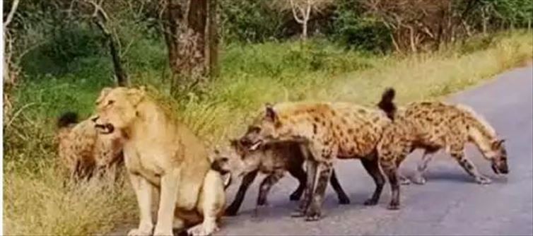 కాస్త బలహీనంగా ఉన్న ఆడ సింహం ఒకటి అనుకోకుండా ఒంటరిగా రోడ్డుపైకి వచ్చింది. దీంతో అక్కడే ఉన్న నాలుగు హైనాల గుంపు కంట పడింది అని చెప్పాలి. సాధారణంగానే ఈ రెండు జంతువుల మధ్య జాతి వైరం ఉంటుంది. అందులోనూ బలహీనంగా ఉన్న సింహం ఒంటరిగా కూడా ఉంది. ఇంకేముంది హైనలకు ఫుల్ కాన్ఫిడెన్స్ వచ్చేసింది. ఒంటరిగా ఉన్న ఆడ సింహాన్ని నాలుగు హైనాలు పీక్కు తినేందుకు సిద్ధంగా ఉన్నాం అన్నట్లుగా చూస్తున్నాయి. కానీ సింహం లోపల భయాన్ని దాచుకొని బయటికి ప్రతిఘటిస్తూ చిన్నచిన్నగా అడవిలోకి వెళ్లిపోయింది.