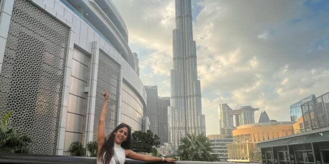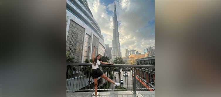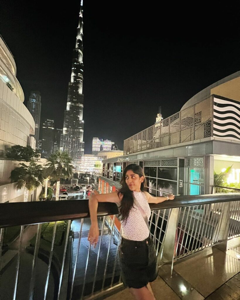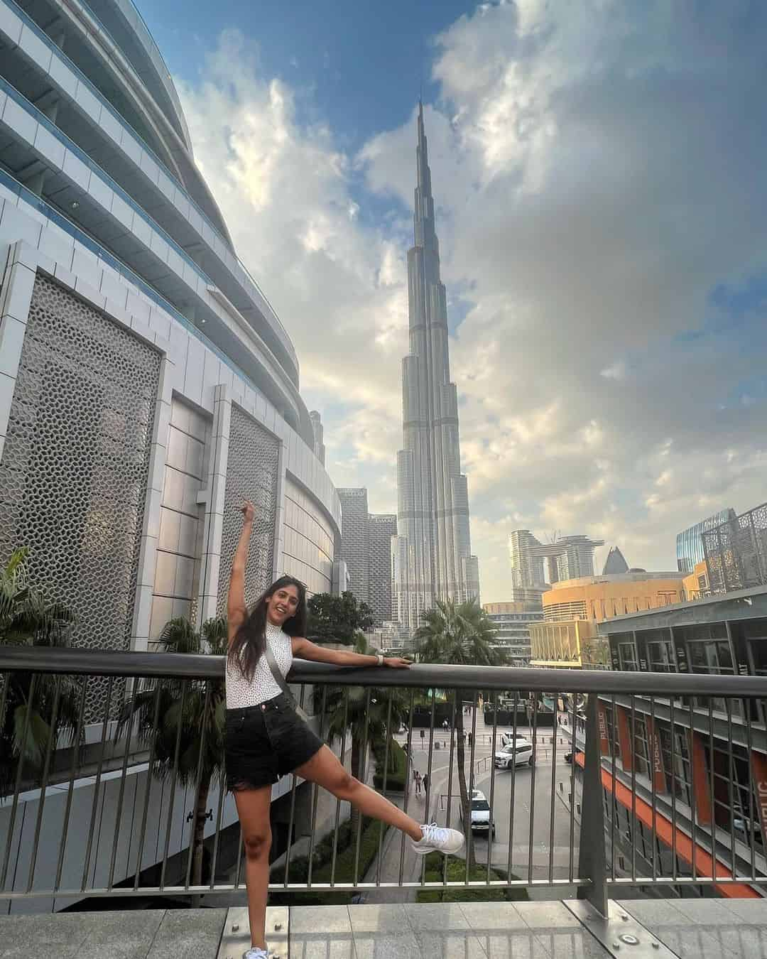 love with the Burj Khalifa there! Photos show the actress with a black and white t-shirt tucked into a short ripped skirt and white trainers appearing pleased and at ease. She was usually spotted doing upbeat poses in front of the monument.
