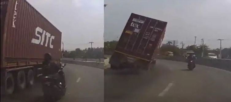 ట్రక్‌ కాస్త టర్న్‌ అవ్వగానే కంటైనర్‌ కుడివైపు అలాగే పడింది. సరిగ్గా ఆ కంటైనర్‌ పడుతున్న సమయంలో బైకర్‌ దెబ్బకి సడన్‌ బ్రేక్‌ వేశాడు. దీంతో క్షణాల్లో తన ప్రాణాలను కాపాడుకున్నాడు. బైకర్‌ బ్రేక్‌ వేయడంలో ఏమాత్రం అటు ఇటైనా కూడా ఖచ్చితంగా ప్రాణాలే కోల్పోయేవాడు. అయితే అదృష్టం కలిసొచ్చి క్షణాల్లో బ్రతికాడు. ఇదంతా కూడా వెనకాల కార్లో ఉన్న వాళ్లు రికార్డు చేశారు. ఈ వీడియోను కాస్త సోషల్‌ మీడియాలో పోస్ట్ చేయడంతో ప్రస్తుతం ఈ వీడియో బాగా వైరల్ అవుతూ తెగ చక్కర్లు కొడుతోంది. బైక్‌పై వెళుతోన్న వ్యక్తి అదృష్టాన్ని చూసి ఆ నెటిజన్లు ఎంతగానో ఆశ్చర్యపోతున్నారు.ప్రస్తుతం ఈ వీడియో సోషల్ మీడియాలో బాగా వైరల్ అవుతూ తెగ చక్కర్లు కొడుతోంది. ఇక సోషల్ మీడియాలో బాగా వైరల్ అవుతున్న ఈ వీడియోని మీరు కూడా చూసేయండి.