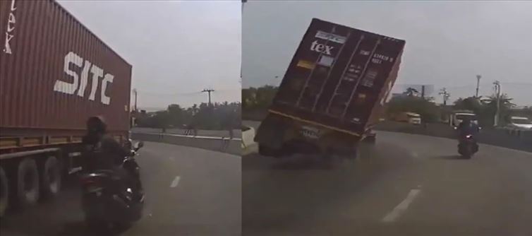 ఇక ఆ కారుకు ముందు వేగంగా దూసుకు వెళ్తున్న ఒక భారీ ట్రక్కు ఉంది. అయితే అతను ఇలా వీడియో చేస్తున్న సమయంలో ఒక్కసారిగా ఒక బైకర్ దూసుకు వచ్చాడు. ఆ ట్రక్ ని ఓవర్టేక్ చేయాలని ఎంతగానో ముందుకు వెళ్లాడు. ఇక అంతలోనే ఒక పెద్ద మలుపు వచ్చింది. అయితే చాలా బరువుతో వెళ్తున్న ఆ భారీ ట్రక్ కంట్రోల్ తప్పింది. దీంతో ఇక మలుపు దగ్గర కంటైనర్ కుడి వైపుకు పడింది. అయితే సరిగ్గా కంటైనర్ పడుతున్న సమయంలోనే బైక్ నడుపుతున్న వ్యక్తి ఇక ఆ కంటైనర్ పక్కనే ఉన్నాడు. ఒక్కక్షణం ఆలస్యమైనా కూడా ఆ కంటైనర్ అతని మీద పడిపోయి ప్రాణాలు పోయేవి. కానీ సడన్గా బ్రేక్ వేయడంతో రెప్పపాటు కాలంలో ప్రాణాలతో బయటపడ్డాడు. ఇది చూసి అతను నిజంగా అదృష్టవంతుడే అని కామెంట్లు చేస్తున్నారు నేటిజన్స్.