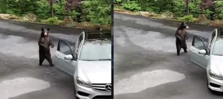 అయితే ఇప్పటివరకు చిరుతపులులు సింహాలు లాంటి జంతువులు అటు జనావాసాల్లోకి వచ్చిన ఘటనలు చాలాసార్లు వెలుగులోకి వచ్చాయి. ఇలా జనాభాసాల్లోకి వచ్చిన జంతువులు కొన్ని కొన్ని సార్లు ఇక మనుషులపై దాడి చేసి గాయపరిచిన సందర్భాలు కూడా ఉన్నాయి. అయితే అటు అడవుల్లో ఉండే ఎలుగుబంట్లు మాత్రం చాలా తక్కువగా జనావాసాల్లోకి రావడం చూస్తూ ఉంటాం. ఇక్కడ ఇలాంటి తరహా ఘటన వెలుగులోకి వచ్చింది. ఏకంగా అమెరికాలో ఇంటి బయట పార్క్ చేసి ఉన్న కారు దగ్గరికి ఒక ఎలుగుబంటి వచ్చింది. అయితే ఇక అది అడవిలోకి వెళ్ళిపోతుందని ఆ కారు యజమానులు అనుకున్నారు.