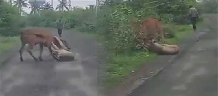 ఏకంగా రోడ్డు పక్కన గడ్డిమేస్తున్న ఒక ఆవుని సింహం వేటాడాలని ప్రయత్నిస్తుంది. ఈ క్రమంలోనే పొదల్లో నుంచి పరిగెత్తుకుంటూ వచ్చి ఆవు మెడను గట్టిగా పట్టుకుంటుంది. ఆవు నొప్పితో విలవిలలాడిపోతూ ఉంటుంది అని చెప్పాలి. ఈ క్రమంలోనే కాపాడండి అన్నట్లుగా దాని భాషలో పెద్దగా అరుస్తూ ఉంటుంది. అయితే ఇక తాను పెంచుకుంటున్న ఆవు అరుపులు విన్న రైతు అక్కడికి పరిగెత్తుకుని వస్తాడు. అయితే అక్కడ ఉండి ప్రమాదకరమైన సింహం అని తెలిసిన అతను పట్టించుకోలేదు. ఆవును కాపాడుకోవడానికి చెయ్యిని ఊపుతూ గట్టిగా అరుస్తూ సింహాన్ని భయపెట్టే ప్రయత్నం చేశాడు. సింహం నుంచి విడిపించుకునే ప్రయత్నంలో ఆవు రోడ్డు పక్కకు జరుగుతుంది. ఇక రోడ్డు పక్కనే ఉన్న ఒక రాయి.. తీసుకొని సింహం వైపుకు రైతు రావడంతో సింహం భయపడి అక్కడ నుంచి పారిపోతుంది. ఇది చూసి నేటిజన్స్ రైతు తెగువను మెచ్చుకుంటున్నారు.