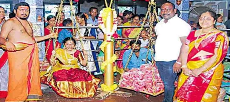 ఇకపోతే ఇలాంటి సమయంలో ఒక తండ్రి తన కుమార్తెకు టమోటోలతో తులాభారాన్ని నిర్వహించారు. ఆంధ్రప్రదేశ్లోని అనకాపల్లి జిల్లాలో కేంద్రంలోని నూకాలమ్మ ఆలయంలో.. నగరానికి చెందిన మల్ల జగ్గా అప్పారావు, మోహిని దంపతుల కుమార్తె భవిష్యకు బెల్లంతో మొక్కు చెల్లించుకునేందుకు తులాభారం నిర్వహించగా ఇప్పుడు టమోటో లను బంగారంతో పోలుస్తున్నారు. కాబట్టి ఆయన కూడా తన కుమార్తెను ఇలా టమాటో లతో తులాభారాన్ని నిర్వహించారు. సుమారుగా 50 కిలోలు టమాటో లు వినియోగించారని తెలుస్తోంది. ముందుగా టమాటో లతో కుమార్తె తులాభారాన్ని కొలిచి ఆ తర్వాత పంచదార, బెల్లం వంటి పదార్థాలతో తులాభారం నిర్వహించారు. వాటిని దేవస్థానానికి అప్పారావు ఫ్యామిలీ అప్పగించగా.. ఈ టమాటో లను నిత్య అన్నదానంలో ఉపయోగిస్తున్నామని దేవస్థానం అధికారులు వెల్లడించారు . అయితే ఈ తులాభారాన్ని చూడడానికి గుడికి వచ్చిన భక్తులు చాలా ఆసక్తిగా చూడడం ప్రస్తుతం ఈ విషయం నెట్టింట చాలా హల్చల్ చేస్తోంది. టమాటో కోసం మినీ సైజు యుద్ధమే జరుగుతుంటే నువ్వు మాత్రం నీ కూతురికి టమోటో లతో తులాభారం వేసావంటే నువ్వు గొప్పోడివి బాసు అంటూ నెటిజన్లు కామెంట్లు చేస్తున్నారు.