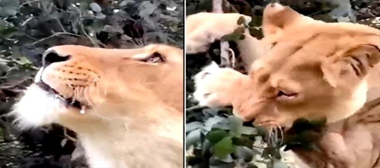 అసలు విషయం ఏంటంటే..ఒక సింహం వేటాడి జంతువులను తినడం చూసిన మనకి ఇది నిజంగానే ఆశ్చర్యం కలిగిస్తుంది. మనం చూస్తున్నది నిజమేనా అని రీప్లే చేస్తుంటాం. ఒక సింహం సాధువు జంతు మాదిరి ఆకులు తింటోంది. అవును మీరు విన్నది నిజమే. సింహం ఆకులు తింటున్న వీడియో ఒకటి ఇప్పుడు వైరల్ అవుతుంది. ఏంటి సింహం ఆకులు తినడం ఏంటని అందరు షాక్ అవుతున్నారు. ఈ వీడియోలో ఉన్న సింహం పులిలానే కనిపిస్తుంది. కానీ ఏదో సాధువు జంతువు మాదిరిగా ఆకులు అలమలు తింటోంది. ఈ వీడియో చూసిన వారందరు సింహం సడెన్ గా శాఖహారిగా మారిందంటూ కామెంట్లు పెడుతుండగా, కొందరు ఇది శ్రావణ మాసం కదా అందుకే ఆ సింహం ఆకులు తింటుందని ఫన్నీగా కామెంట్లు పెడుతున్నారు. సోషల్ మీడియాలో ఇప్పుడు ఈ వీడియో వైరల్ అవుతుండగా, ఈ వీడియో చూసిన వారందరు షేర్ చేయకుండా ఉండలేకపోతున్నారు.