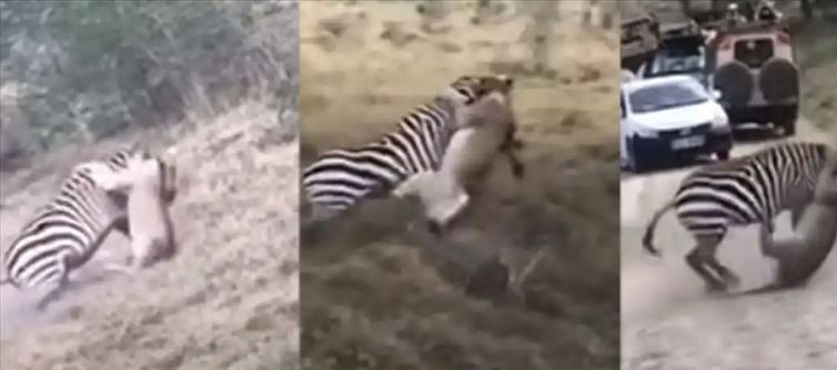 ఊహించని రీతిలో ఆ సింహం నుంచి ఎస్కేప్ అయింది. ఆడసింహం ఒంటరిగా ఉన్న జీబ్రాను టార్గెట్ చేసి సరైన సమయం చూసి వేగంగా వెళ్లి పంజా విసిరింది. అయితే సింహం దాడిని ఊహించని జీబ్రా దాన్ని నుండి తప్పించుకునే క్రమంలో పరుగులు పెడుతుంది. అయినా సింహం వదలకుండా జిబ్రా మెడను గట్టిగా పట్టుకుంటుంది. దీంతో ఏకంగా సింహాన్ని ఈడ్చుకుంటూ వెళ్తుంది జీబ్రా. తర్వాత ఈ రెండు కూడా పల్టీలు కొడతాయి. అయినా సింహం వదలదు. చివరికి గట్టిగా వదిలించుకోగానే.. అప్పటికే అలసిపోయిన సింహం పట్టు విడుస్తుంది. దీంతో బతుకు జీవుడా అనుకుంటూ జీబ్రా అక్కడ నుంచి ఎస్కేప్ అవుతుంది.