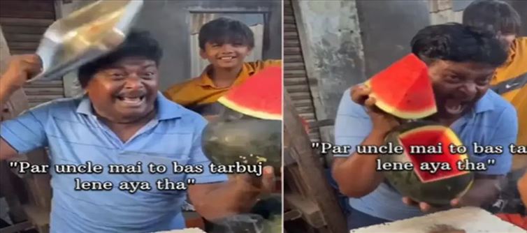 ఎందుకంటే ఏకంగా మనుషులను భయపెట్టే విధంగా.. ఇక్కడ ఒక వ్యక్తి పుచ్చుకాయలను అమ్ముతున్నాడు. దీంతో అటువైపుగా వెళ్తే పుచ్చకాయలను కొనాలని ఉద్దేశం లేకపోయినా అతను ఎక్కడ కొడతాడో అనే భయంతో చివరికి కొనయొచ్చు కూడా. ఒక వ్యక్తి బండి పై పుచ్చకాయలు పెట్టుకొని అమ్ముతున్నాడు. ఆ సమయంలో అతడు చర్యలు చూసి ఎవరైనా భయపడతారు. పుచ్చకాయ కోసి దానిని చూపించి.. నోరు తెరిచి బిగ్గరగా అరుస్తున్నాడు. అక్కడితో ఆగకుండా తలపై స్టీల్ ట్రే తో కొట్టుకొని విత్తగా అరుస్తున్నాడు. ఇక అతడి చేష్టలు చూసి చుట్టూ ఉన్నవారు పగలబడి నవ్వుకుంటున్నారు. పాపం కుటుంబ పోషణ కోసం అతనికి ఎంత కష్టం వచ్చింది అని ఇంకొంతమంది కామెంట్లు చేస్తున్నారు.