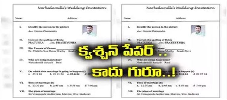 వృత్తిరీత్యా టీచర్గా అయిన ప్రత్యూష ఫణీంద్ర అనే అబ్బాయిని ఆగస్టు 23వ తేదీ పెళ్లి చేసుకోనుంది. పెద్దలు కుదిర్చిన ఈ వివాహం తనకు అనుగుణంగానే జరగాలని ప్రత్యూష అనుకుంది. ఇరు కుటుంబ సభ్యులు అతిథులను పెళ్లికి పిలిచే పనిలో పడ్డప్పుడు ప్రత్యూష కి ఒక అదిరిపోయే ఐడియా వచ్చింది. అదేంటంటే తన పెళ్లి పత్రిక తన తన ప్రొఫెషన్కు తగినట్లుగా డిజైన్ చేయిద్దామని ఆమె అనుకుంది. తన టీచర్ బ్రెయిన్ కి కొంచెం పని పెట్టి క్వశ్ఛన్ పేపర్ రూపంలో పెళ్లిపత్రిక చాలా వినూత్నంగా తయారు చేయించింది. ఈ శుభలేఖలో ఎనిమిది ప్రశ్నలు ఉంటాయి. వాటికి సమాధానం ఇవ్వాలంటూ ప్రత్యూష తన బంధుమిత్రులకు ఇన్విటేషన్ కార్డ్స్ సెండ్ చేసింది.