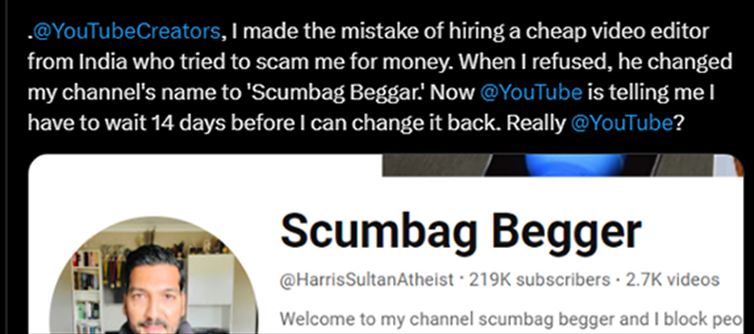 He said, ".@YouTubeCreators, I made the mistake of hiring a cheap video editor from india who tried to scam me for money," in a post on "X," the former twitter platform. He renamed my channel "Scumbag Beggar" after I declined. I am now being informed by @YouTube that I must wait 14 days in order to change it back. Really, @YouTube?