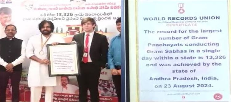 ఆంధ్ర ప్రదేశ్ ఉప ముఖ్యమంత్రి, పంచాయతీరాజ్ గ్రామీణాభివృద్ధి శాఖ మంత్రి పవన్ కల్యాణ్ బాధ్యతలు స్వీకరించిన 100 రోజులలోపే రాష్ట్ర ప్రభుత్వం ప్రతిష్టాత్మకంగా చేపట్టిన గ్రామ సభల నిర్వహణ ప్రపంచ రికార్డు సాధించింది. ఆగస్టు 23వ తేదీన ‘స్వర్ణ గ్రామ పంచాయతీ’ పేరిట రాష్ట్రవ్యాప్తంగా ఉన్న 13,326 పంచాయతీల్లో ఒకే రోజు గ్రామ సభలు నిర్వహించారు. రూ.4500 కోట్ల విలువైన ఉపాధి హామీ పనులకు తీర్మానాలు చేశారు.రాష్ట్రవ్యాప్తంగా ఒకే రోజు 13,326 గ్రామ పంచాయతీల్లో గ్రామ సభలు నిర్వహణకు ఆ శాఖకు ప్రపంచ రికార్డు దక్కింది. వరల్డ్ రికార్డ్స్ యూనియన్ ఆంధ్రప్రదేశ్ లో ఆగస్టు 23వ తేదీన నిర్వహించిన గ్రామ సభలను గుర్తించింది. ఇందుకు సంబంధించిన రికార్డు సర్టిఫికెట్, మెడల్ ను ఇవాళ ఉప ముఖ్యమంత్రి పవన్ కల్యాణ్ కు వరల్డ్ రికార్డ్స్ యూనియన్ అఫిషియల్ రికార్డ్స్ మేనేజర్ క్రిస్టఫర్ టేలర్ క్రాఫ్ట్ అందచేశారు. హైదరాబాద్ లోని పవన్ కల్యాణ్ నివాసంలో ఈ కార్యక్రమాన్ని నిర్వహించారు.ఈ రికార్డు సర్టిఫికెట్ ను డిప్యూటీ సీఎం పవన్ కల్యాణ్ కు అందజేశారు. గ్రామ స్వరాజ్యం దిశగా ఆంధ్రప్రదేశ్ దూసుకెళ్తుందని పవన్ కల్యాణ్ అభిప్రాయపడ్డారు.ఈ నేపథ్యంలో గ్రామాలకు స్వపరిపాలన అందించాలనే ఆకాంక్షతో మొదలైన ఈ ప్రయాణంలో ఈ కొత్త మైలురాయిని అందుకోవడం ఆనందంగా ఉందని రాష్ట్ర ఉప ముఖ్యమంత్రి పవన్ కల్యాణ్ సంతోషం వ్యక్తం చేశారు. గ్రామసభలు విజయవంతం చేయడంలో భాగస్వాములైన అధికార యంత్రాంగానికి, స్థానిక సంస్థల ప్రతినిధులకు అభినందనలు తెలిపారు. గ్రామసభలో పాల్గొని దిశానిర్దేశం చేసిన సీఎం చంద్రబాబుకి కృతజ్ఞతలు తెలిపారు. రాష్ట్ర మంత్రులు, ఎమ్మెల్యేలు, ఎంపీలు గ్రామసభల్లో భాగస్వాములైనందుకు ధన్యవాదాలు తెలిపారు. ఈ కార్యక్రమంలో రాష్ట్ర పంచాయతీరాజ్ గ్రామీణాభివృద్ధి శాఖ ముఖ్య కార్యదర్శి శ్రీ శశిభూషణ్ కుమార్, పంచాయతీరాజ్ గ్రామీణాభివృద్ధి డైరెక్టర్ శ్రీ కృష్ణ తేజ, ఉపాధి హామీ పథకం డైరెక్టర్ శ్రీ షణ్ముఖ్, సంయుక్త కమిషనర్ శ్రీ శివప్రసాద్ పాల్గొన్నారు.
