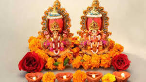 · Kalash, rice, haldi, kumkum, coins, sweets, and oil lamps