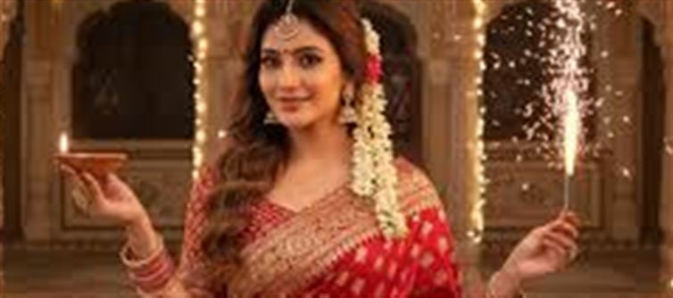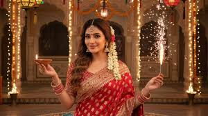 "A warm diwali evening scene with people dressed in sarees and kurtas, celebrating with traditional sweets."