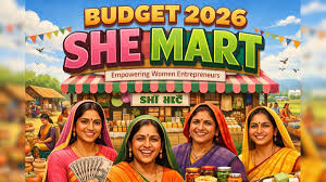 SHE Marts (Self‑Help Entrepreneur Marts) are community‑owned retail outlets planned under the Union Budget 2026 to help women and girls — especially those linked with Self‑Help Groups (SHGs) — sell their products directly to consumers without middlemen, giving them better market access and sustainable income opportunities.