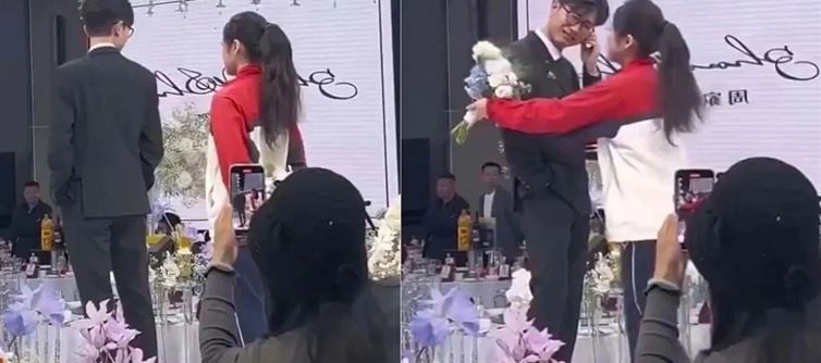 పెళ్లి బట్టల్లో తన భార్యను చూడాలని ఎదురుచూస్తున్న వరుడికి, స్కూల్ డ్రెస్లో ఉన్న ఆమెను చూడగానే ఒక్కసారిగా పాత జ్ఞాపకాలన్నీ కళ్ల ముందు కదలాడాయి.వరుడు స్టేజ్ మీద ఉండగా, వెనుక నుంచి వచ్చిన వధువు మెల్లగా అతడి భుజంపై తట్టింది. అతను వెనక్కి తిరిగి చూడగానే, 11 ఏళ్ల క్రితం తాను ప్రేమించిన ఆ 'స్కూల్ గర్ల్' ఎదురుగా నిలబడి ఉండటంతో అతను ఎమోషనల్ అయ్యాడు.తన భార్య చేసిన ఈ స్వీట్ సర్ప్రైజ్కి అతను ఆనందంతో కన్నీళ్లు పెట్టుకుంటూ, ఆమెను గట్టిగా హత్తుకున్నాడు. ఈ దృశ్యం చూసిన అతిథులందరి కళ్లు చెమర్చాయి.