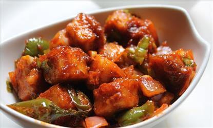 •  Heat a teaspoon of oil in a pan and grill the paneer cubes, turning them over as you do, till the cubes turn a golden brown.