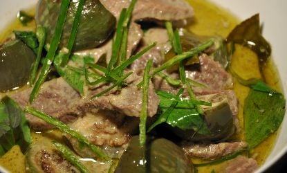 Reheat the pan and stir-fry the onion for 1 minutes until softened. Add the curry paste and Stir-fry for another minute or so. Now add the mange tout and water. Return the meat to the Pan and stir-fry for a further 5 minutes. When the beef has cooked, throw in the basil and Stir-fry for 30 seconds. Serve immediately with boiled rice, if liked.