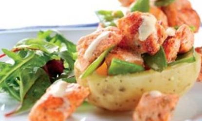 Once cooked, cut a cross in the top each baked potato. Fill with the chilled seafood and serve on a Bed of salad leaves