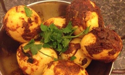 ఒక గిన్నెలో పెరుగు, ఆవనూనె, ఎర్రరంగు, కారం, మసాలా పౌడర్, మెంతికూర, ఉప్పు, చనా మసాల బాగా కలిపి అందులో కోసిన గుడ్లు వేసి పది నిమిషాలు వుంచాలి. ఆగుడ్ల ముక్కలను ఒఖ పుల్లకు గుచ్చి తండూరి పొయ్యిలో కాల్చాలి. బాగా కాలాక చాట్ మసాలా చల్లి తింటే రుచు అమోగం.
