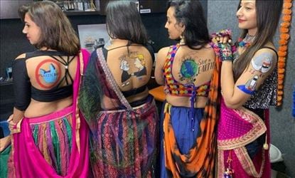 నవరాత్రుల్లో భాగంగా జరిగిన రాస్ గర్బా సందర్భంగా కొంతమంది తమ శరీరం వెనుకవైపు అందరికీ కనిపించే విధంగా వివిధ ఆకారాలను చిత్రించుకుని కనిపించారు. వీరిలో ఇద్దరు అమ్మాయిలు వెరైటీ ని కోరుకున్నారు. చంద్రయాన్ 2 , ఆర్టికల్ 370 , అదే విధంగా రోడ్ సేఫ్టీ వంటి చిత్రాలను వేసుకున్నారు. వారు వేసుకున్న ప్రస్తుత ఇమేజ్ లు టాటూలు ఆ టాటూలు ప్రస్తుతం వైరల్ అయ్యాయి..