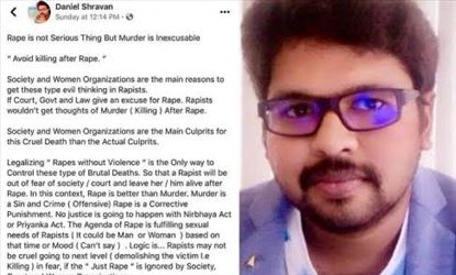 വനിതാസംഘടനകളും, സമൂഹവുമാണ്, ഇത്തരം ക്രൂര കൃത്യങ്ങളുടെ, ഉത്തരവാദികൾ.വീരപ്പനെ കൊന്നാൽ, കള്ളക്കടത്ത് ഇല്ലാതാകുമെന്നും, ലാദനെ കൊന്നാൽ, ഭീകരവാദം ഇല്ലാതാകുമെന്നും, പറയുന്നത് പോലെയാണ്, ബലാത്സംഗം ചെയ്യുന്നവരെ, കുറ്റക്കാരായി കാണുന്നതെന്നും, ഡാനിയൽ ശ്രാവൺ കൂട്ടിച്ചേർത്തു.