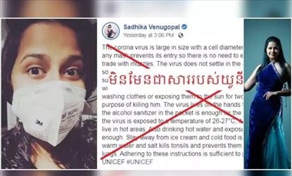 ടെലിവിഷന് താരവും സിനിമാ നടിയുമായ സാധിക വേണുഗോപാൽ തന്റെ ഫേസ്ബുക്ക് പേജിലൂടെ കൊറോണ വൈറസിനെപറ്റി പോസ്റ്റ് ചെയ്തിരുന്ന പോസ്റ്റ് വ്യാജമാണെന്ന അറിയിപ്പുമായി രംഗത്തെത്തിയിരിക്കുകയാണ് യൂണിസെഫ് കംബോഡിയ. യൂണിസെഫ് കംബോഡിയ ട്വിറ്റര് പേജിലൂടെയാണ് ഇക്കാര്യം അറിയിച്ചിരിക്കുന്നത്.തന്റെ ഫേസ്ബുക്ക് പോസ്റ്റ് സാധിക പിന്വലിക്കുകയും ചെയ്തിരിക്കുകയാണ്.