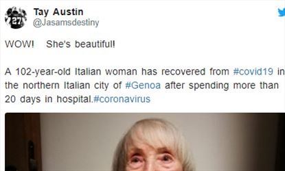 വടക്കൻ ഇറ്റാലിയൻ നഗരമായ ജെനോവയിലെ കൊറോണ വൈറസിൽ നിന്ന് 102 വയസ്സുള്ള ഒരു സ്ത്രീ 20 ദിവസത്തിലേറെ ആശുപത്രിയിൽ കഴിഞ്ഞ ശേഷം സുഖം പ്രാപിച്ചുവെന്ന് ചികിത്സിച്ച ഡോക്ടർമാരും മരുമകനും സിഎൻഎന്നിനോട് പറഞ്ഞു.ഇങ്ങനെയാണ് ട്വിറ്ററിൽ പോസ്റ്റ് ഇട്ട ഒരു വ്യക്തി കുറിച്ചിരുന്നത്.