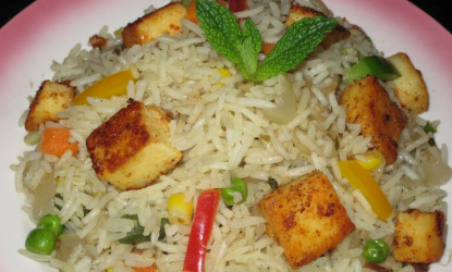 కావలసిన పధార్ధాలు : బాసుమతి బియ్యం : 2 కప్పులు కాలీప్లవర్ : 2 కప్పులు ఉల్లిపాయలు : 1 కప్పు (సన్నగా పొడవుగా కట్ చేసినవి) పన్నీర్ : 250 గ్రాములు లవంగాలు : నాలుగు నల్ల యాలకులు : నాలుగు  నెయ్యి : (నూనె) 10 చెంచాలు కారప్పొడి : 1 చెంచా బంగాళదుంపలు : రెండు పచ్చిబఠాణీ : 1 కప్పు దాల్చిన చెక్క : రెండు అంగుళాలు బిరంజి ఆకు : రెండు జీలకర్ర : 1 స్పూను నిమ్మకాయ : రెండు తయారీ చేయువిధానం : బాస్మతి బియ్యం కడిగి 10 నిమిషాలు నాననిచ్చి నీరు వంచేసి బాండీలో 1 చంచా నెయ్యివేసి తడి ఇంకేంత వరకు బియ్యాన్ని వేసి వేపాలి. బాండీలో నెయ్య వేసి పన్నీర్ ముక్కలను వేసి ఎర్రగా వేసి తీసి వేడి నీటిలో కొంచెం మెత్తగా అయిన తర్వాత తీసి వేరుగా ఉంచాలి. మిగిలిన నేతిలో ఉల్లిముక్కలు వేసి వేరుగా ఉంచాలి. తర్వాత దినుసులన్నీ వేసి వేరుగా ఉంచాలి. తర్వాత దినుసులన్నీ వేసి వేగిన తర్వాత కూరలు, బఠాణీకి, ఉప్పు వేసి ఐదు నిమిషాలు సెగమీద బియ్యాన్ని ఉడకనివ్వాలి. ఉడికిన తర్వాత నిమ్మరసం పిండి బాగా కలియబెట్టి దించి పైన ఉల్లిముక్కలు, పన్నీరు ముక్కలు అలంకరించి వేడి వేడిగా సర్వ్ చేయాలి.