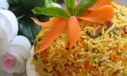 5. Serve hot the carrot rice, garnished with chopped coriander leaves and roasted nuts.