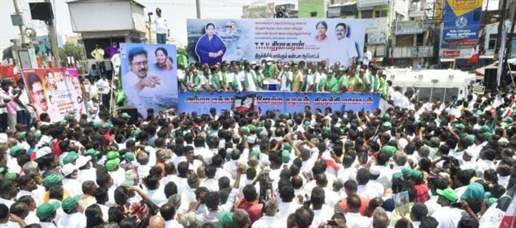 Demonstrations took place today in Trichy on behalf of the Amma People's Progressive Association, condemning the karnataka government's allocation of funds for the construction of the Megathattu Dam and demanding that the Central and State Governments stop the karnataka government's move and not build a dam in the Megathattu. The party's general secretary DTV Dinakaran led the protest in the Trichy Chintamani Anna statue area,