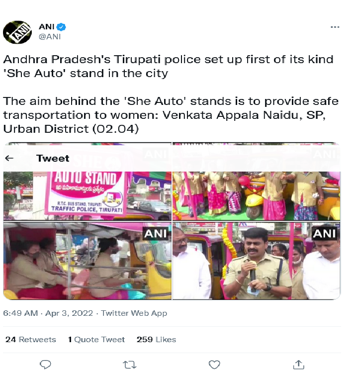 MLA to the Superintendent of police for giving priority to women and paying special attention to the safety of female auto drivers. Congratulations. “Tirupati is the first city in the state to set up exclusive auto stands for women.