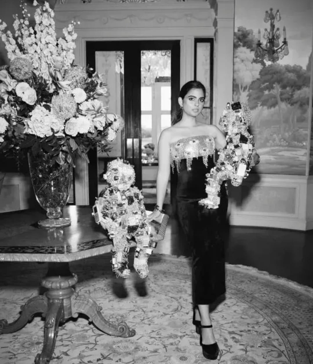 On june 25, 2024, Isha Ambani's stylist Anita Shroff Adajania shared a monochrome picture of the super cool mommy with her kids. However, for a moment, we were left stunned by Isha's choice of outfits for her kids. She chose iconic outfits from the international brand 'Schiaparelli' for her twins Adiya and Krishna. In the picture, we can see Isha holding one baby in her lap, while the other baby is sitting on the table next to her.
