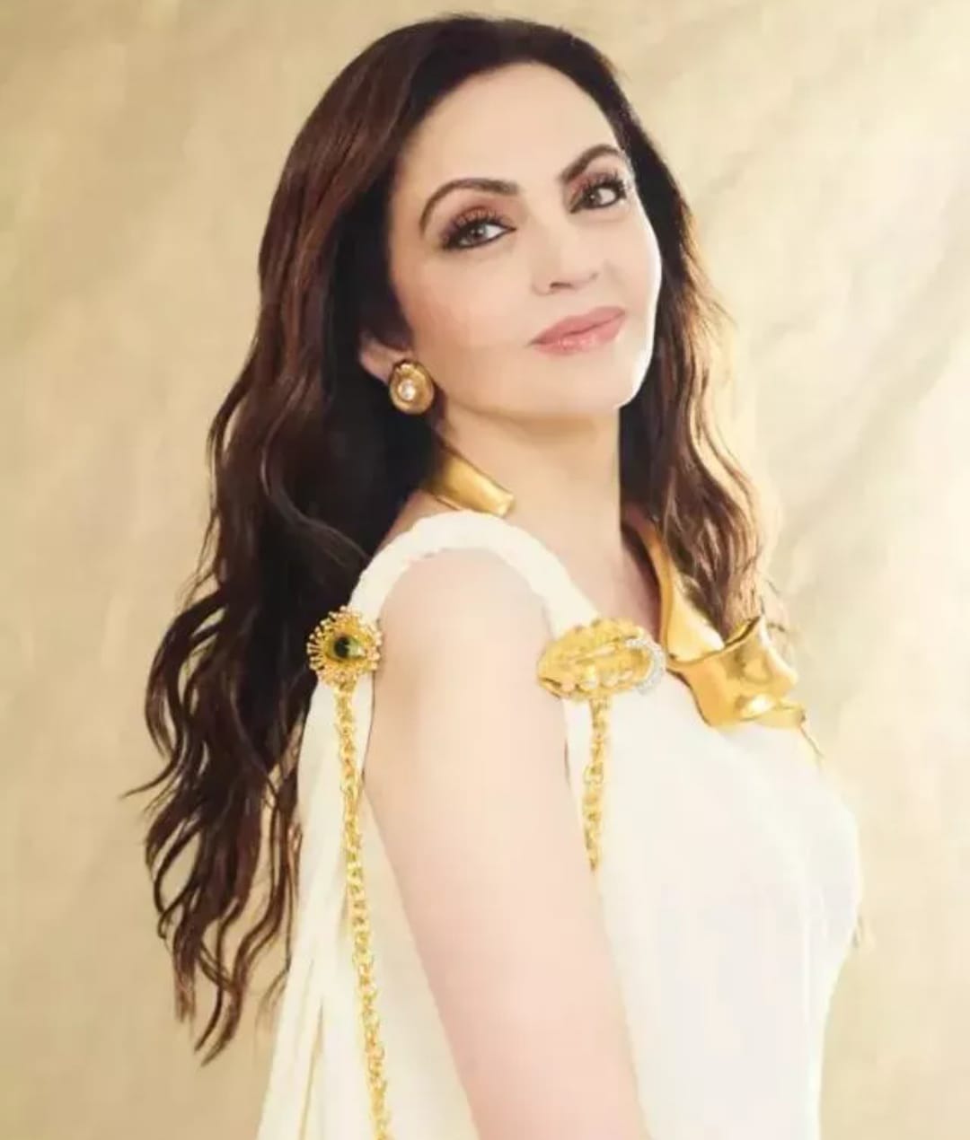 Nita Ambani chose a white toga (a loose outfit worn by people in ancient Rome) from the luxury brand 'Schiaparelli' for the toga party during Anant and Radhika's cruise pre-wedding. She matched this flowy outfit with stunning jewelry from the same brand, which included a double brooch, necklace, and studs. She opted for her signature makeup to complete her look.