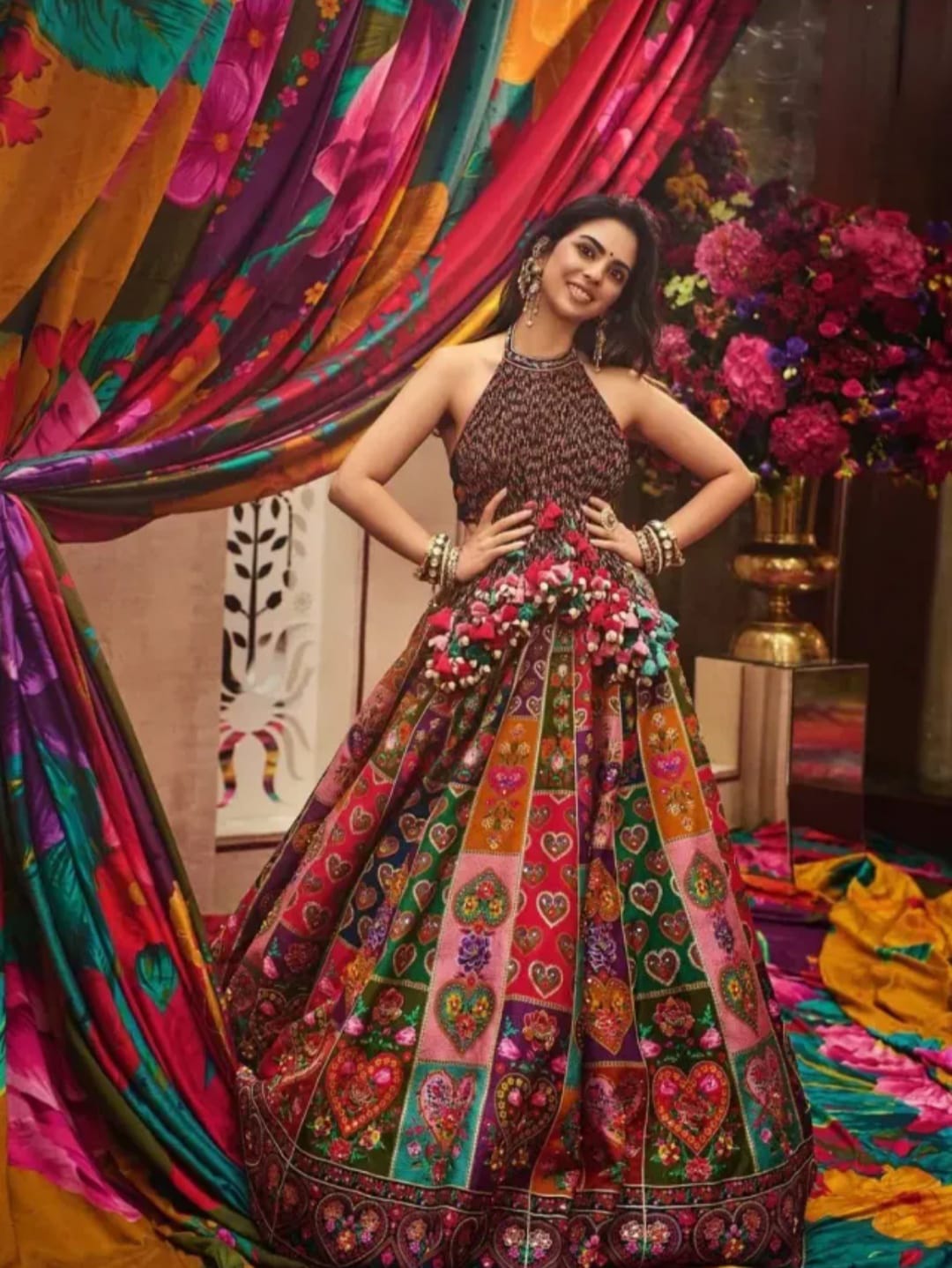 At Anant's haldi, Isha showed off her great style game in a multi-colored paneled lehenga from the Torani label. Her lehenga had heart prints on it. However, the highlight of her look was that the businesswoman gave her outfit an Indo-Western touch by pairing it with a halter-neck top with shell-tassel detailing. To enhance her look, Isha chose Kundan bangles and a special ear cuff. Soft makeup and a bindi completed Isha's overall look.