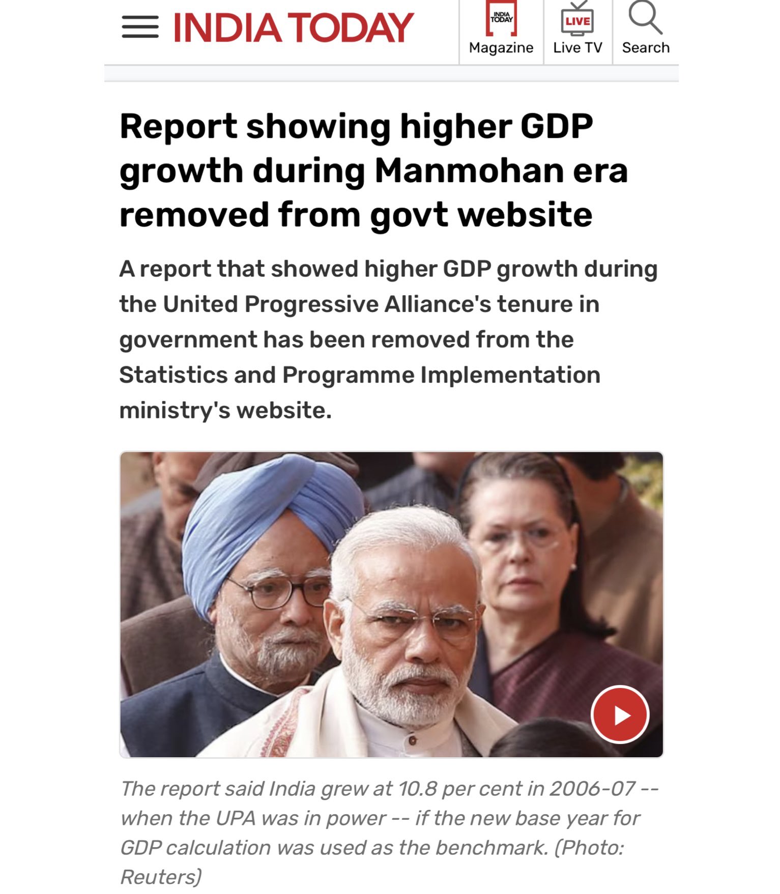 manmohan era removed from govt website." The article highlights the removal of a report from the Statistics and Programme Implementation Ministry’s website, which revealed that India’s GDP grew at 10.8% in 2006-07 under the United Progressive Alliance (UPA)