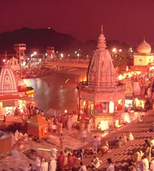 Haridwar is an ancient city and important Hindu pilgrimage site in North India's Uttarakhand state, where the River Ganges exits the Himalayan foothills. The largest of several sacred ghats (bathing steps), Har Ki Pauri hosts a nightly Ganga Aarti (river-worshipping ceremony) in which tiny flickering lamps are floated off the steps. Worshipers fill the city during major festivals including the annual Kanwar Mela.